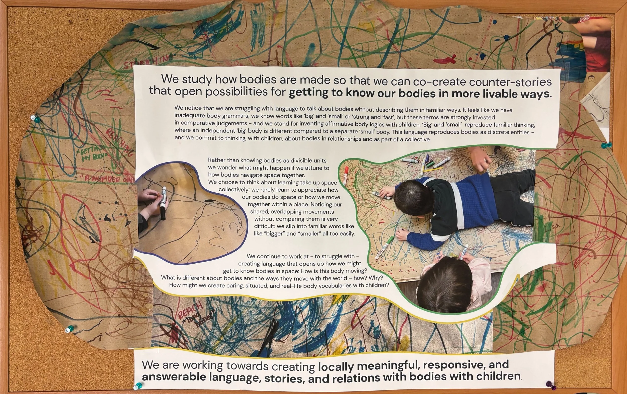 For us, this underscores important questions about how we understand collective-making as/with bodying with children: how do we create a commons that is both capacious and particular, and not-yet-known and oriented to justice, where situated relations and bodies co-compose, inventing and re-inventing the context, accountabilities, and commons? Community and collective-making matter deeply to our ECE context because how we understand the labour of commoning is political (Vintimilla & Berger, 2019). Vintimilla (2023) throws us the question “how do the ways we imagine the commons affect our relation to knowledge and thinking in early childhood educational contexts?” (p. 192). When community is named as an already known or already present project, then already known dominant relations (ex. harmony, consensus), knowledges (ex. developmentalism, corporatization), and subjectivities (ex. innocent child, maternal educator) are reproduced by and to sustain this pre-existing, comfortable conceptualization of community (Vintimilla, 2023). Working with Manning’s (2014) articulation of bodying and relating as generative processes-in-motion, we take seriously that there is no promise that collectives will be liberatory, just, or affirmative; maintaining the status-quo is an event of production, as is the risk of producing increasingly insidious and totalizing relations of governance and conformity. This means that, as we take up the question of doing bodies with children, we want to work at creating and sustaining relations and collectives that are necessarily and generatively uncertain – where this uncertainty opens a space for working otherwise at bodying, relationality, and collective-making. Uncertainty – defamiliarizing, interrupting, the not-yet-present – is not a relativist, hollow, or organic force. From Taylor (2017), we learn that commoning requires a “persistent commitment to reaffirm the inextricable entanglement of social and natural worlds –through experimenting with worldly kinds of pedagogical practice” (p. 1455). From Vintimilla (2023), we carry the question “could we think relations in early childhood from this void that does not ask to be filled with meaning making and instead create space for relations that come to be through its incommensurabilities, its impossibilities?” (p. 187). Taken together, our work of figuring out how we might continually work at co-creating and sustaining more livable –emplaced, fleshed, responsive, affirmative, and ever shapeshifting – bodying relations with children is layered with questions of creating commons that do not foreclose ethics of entangling, worlding, experimenting, resisting, responding, and disorienting.